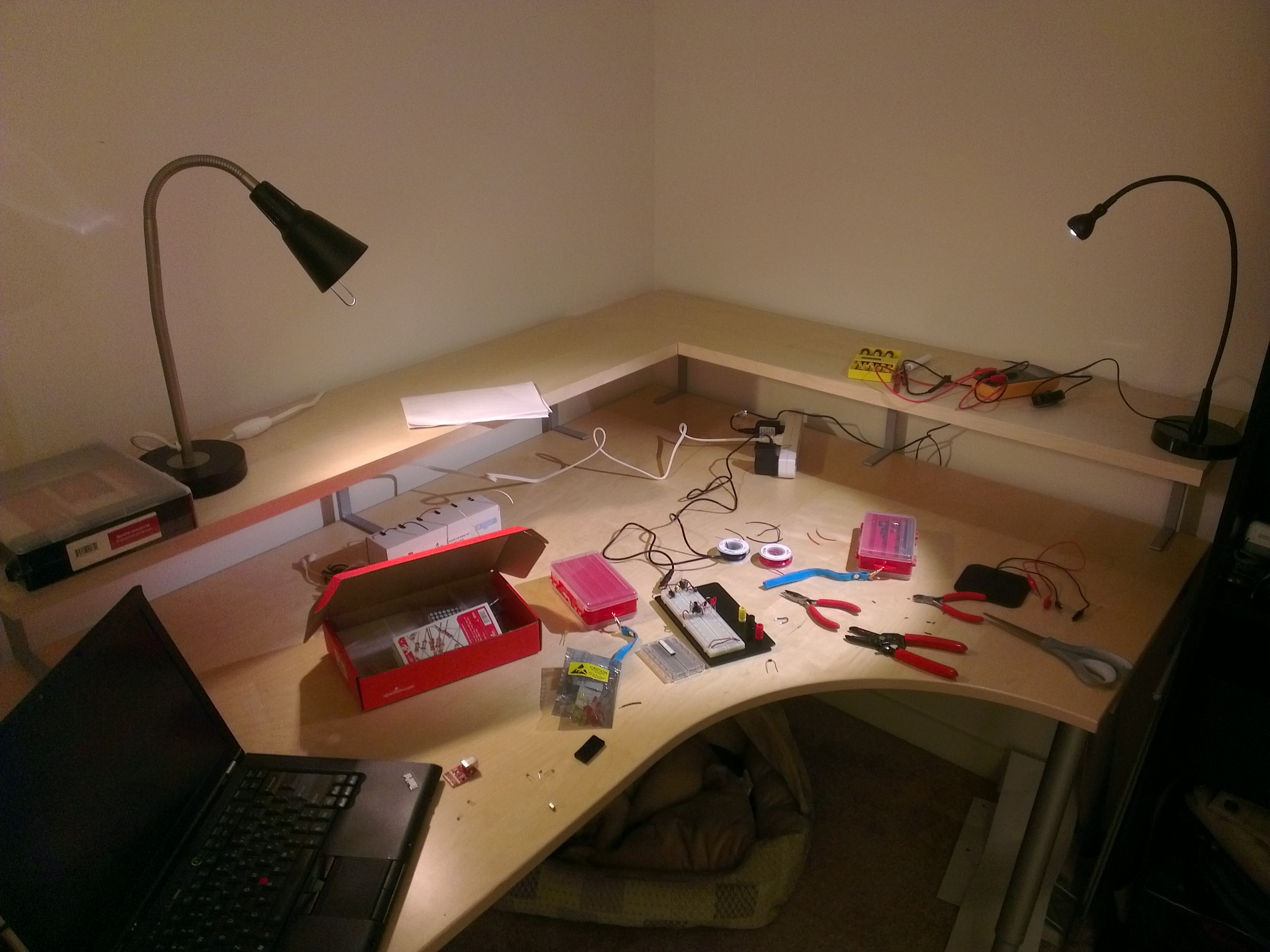 Pretty much everything in this photo other than the desk+lamps+laptop is from SparkFun. My order from them consists of two main parts: their Inventor’s Kit, which is the unopened case on the left, and my attempt to figure out and buy all the individual components I thought I would need. My goal is start from scratch and not open the kit, using it just as a last-resort backup so that hopefully I can give it away; so far I’ve been mostly able to do so. There have been a couple of hiccups: I bought the wrong kind of wire (stranded, when you really want solid core for breadboarding), and I can’t use any of the “breakout boards” I bought since I made the conscious choice to not buy a soldering setup. Luckily, I bought myself enough parts for three different projects I had in mind, so while the CP2103 breakout board is unusable without a soldering iron (trust me, I tried), you can see me playing with a simple RC edge detector on the breadboard.