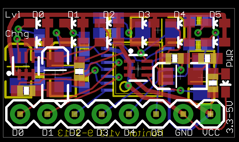 In my Component Area Costs post, I did some back-of-the-envelope calculations to show that, perhaps unsurprisingly, PCB fabrication costs can easily dominate component costs for single- or small-quantity PCB orders. My reaction was to start minimizing the areas of all my PCBs; I think this is generally a good thing, but I wanted to test the limits of this. I’m not sure what limits how small a board can be, so I’ve produced a series of boards that are the same circuit, but in steadily-decreasing board sizes. Here’s the board layout for my latest one, which I just received today:
