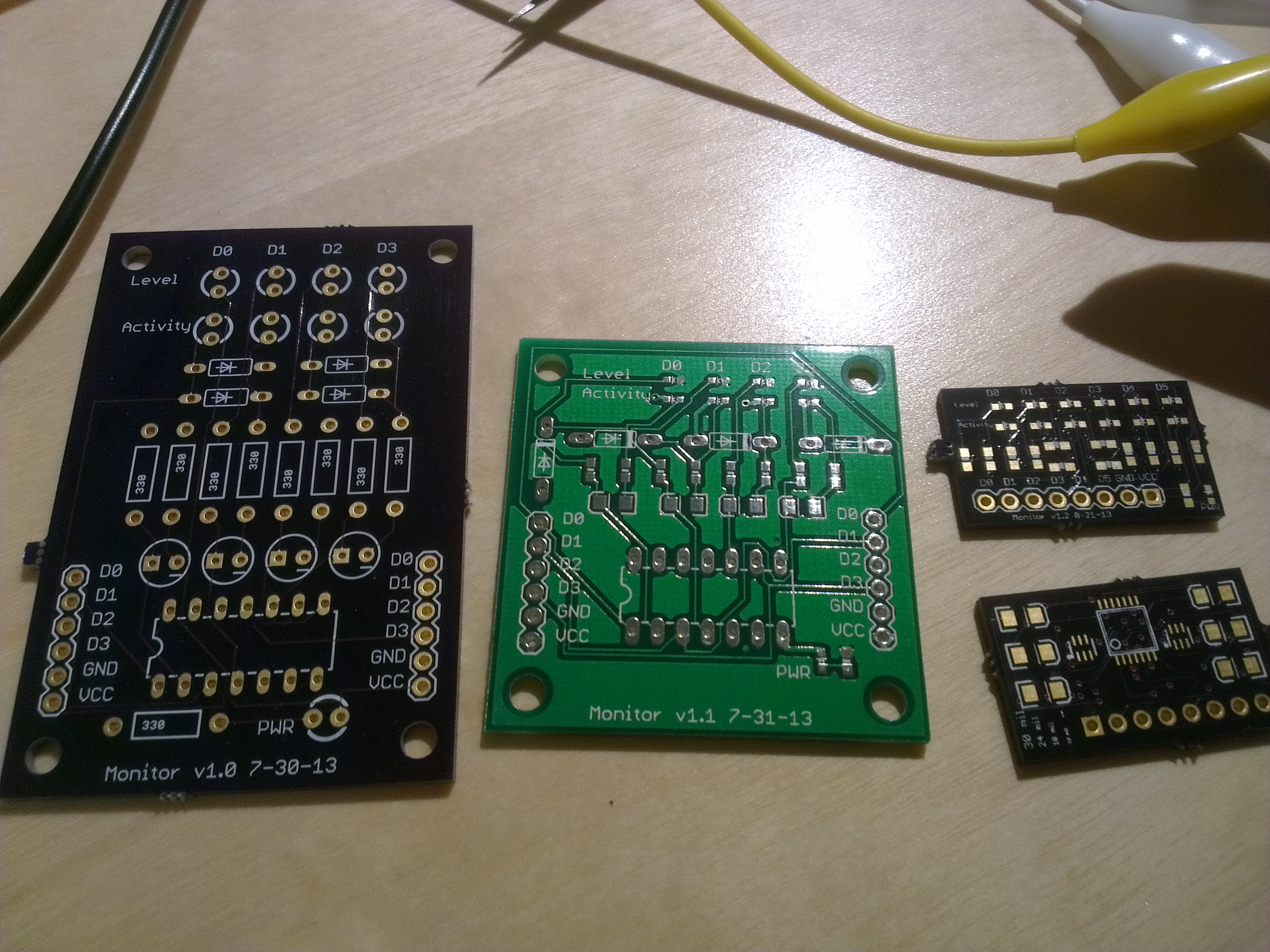 And here’s a picture comparing the board to my previous two iterations; they cost $21.50 for 3 (OSH Park), $9.90 for 10 (Seeedstudio), and $3.55 for 3 (OSH Park) respectively.