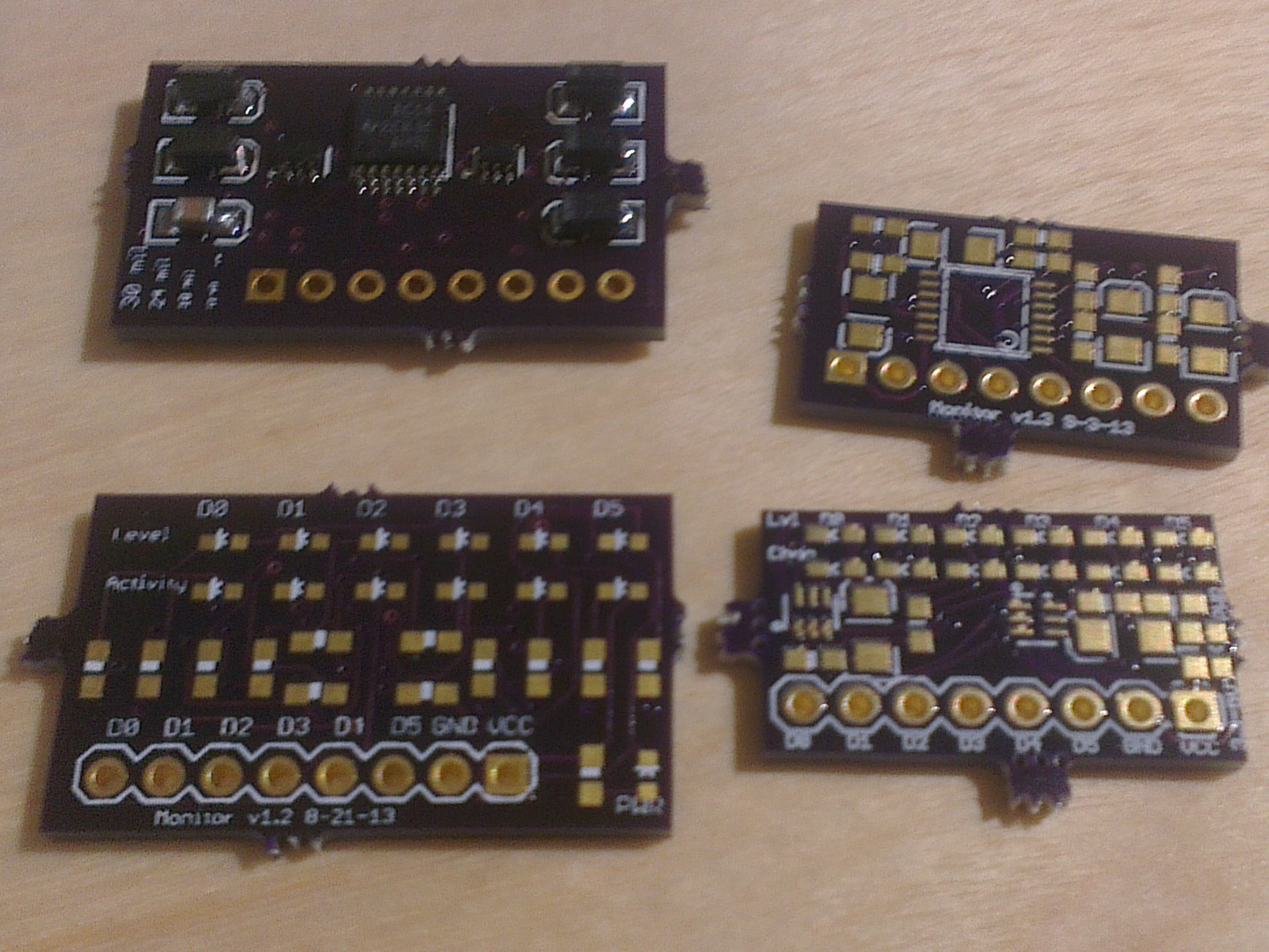 I’ve done a series of circuit board layouts of my simple “Activity Monitor” circuit, at first to teach myself PCB design and try out getting them made, and lately to test different different pcb limits, primarily miniaturization.  In my last post about it, I talked about putting together a board I thought was high-density, and how I submitted a new design that was even more dense.  Well, I got back the boards today and here’s how it went.  First up, here’s a picture comparing the four iterations of the boards:
