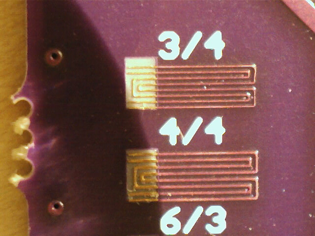 In the both pictures, the 4/4 looks surprisingly good.  The 6/3 looks like it’s pushing it on the spacing, but electrically these simple test patterns seem to have come out ok (the two separate nets are continuous and not connected to each other).  That doesn’t mean I trust that I could use 6/3 for an entire board, and I doubt I’ll ever try it at all, but it’s cool to see that they can do it.