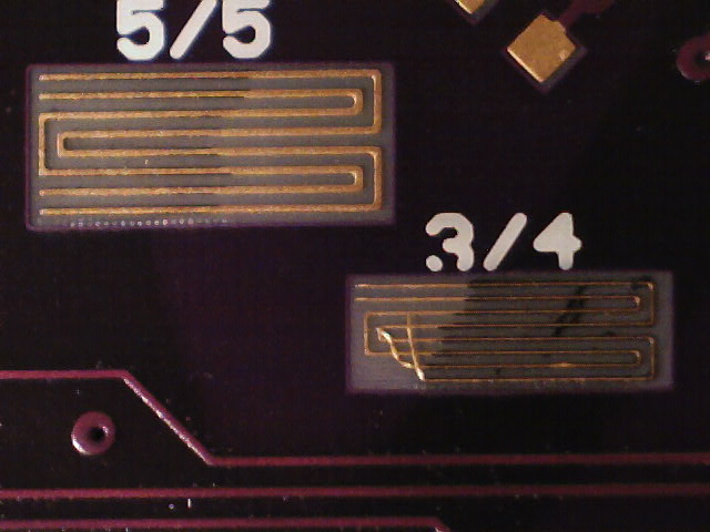 The 3-mil traces did not survive, and ended up delaminating in all three boards.  You can see though just how good the 5/5 traces look in comparison.